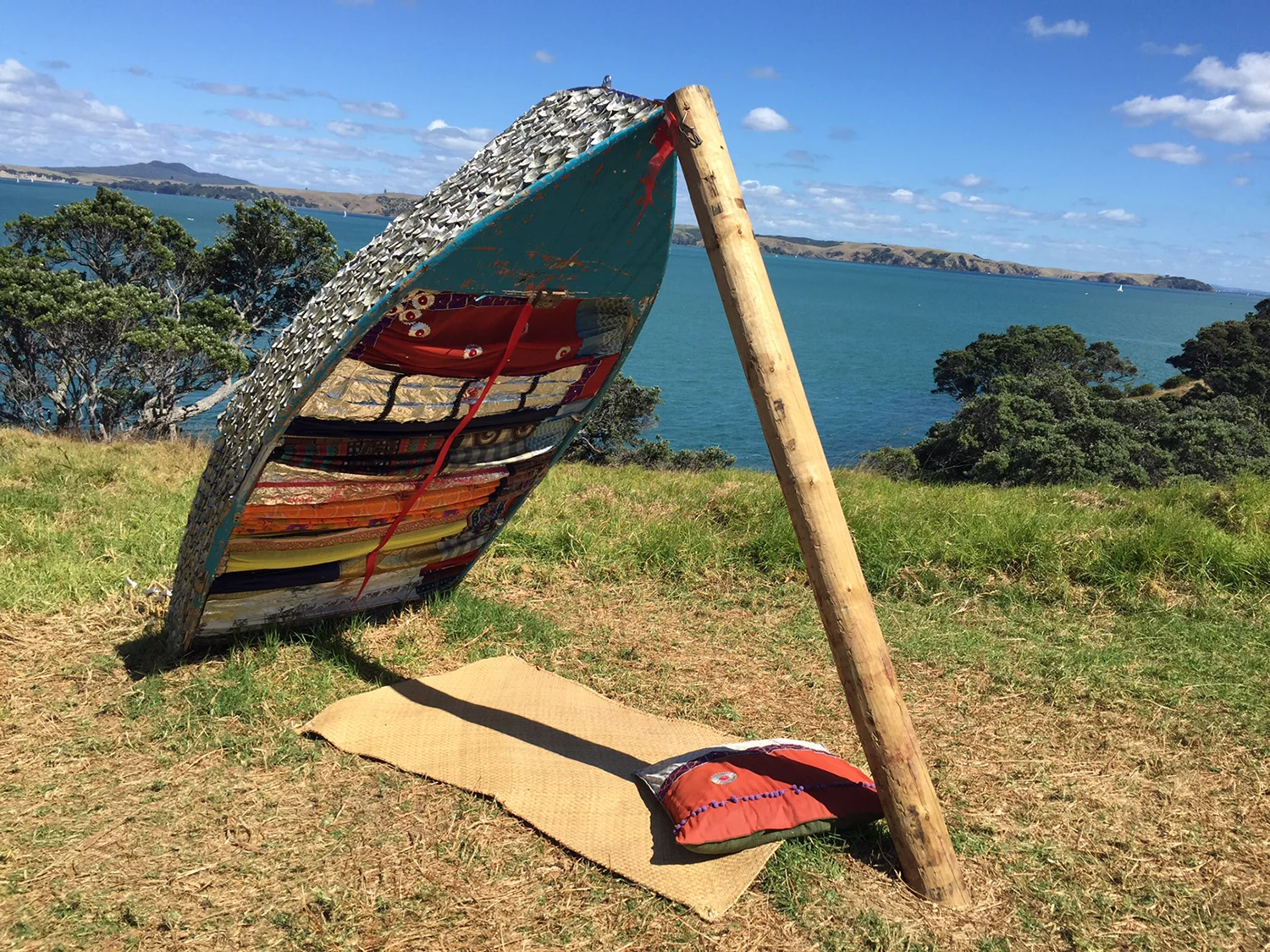 This very moving and powerful work is the culmination of a partnership between Tiffany Singh and the Auckland Resettled Community Coalition. She has used four abandoned boats from Waiheke Island and repurposed them as sound shells for refugee stories. Materials include emergency blankets, saris, clay and wood. The sound composition is by Steven Hue.