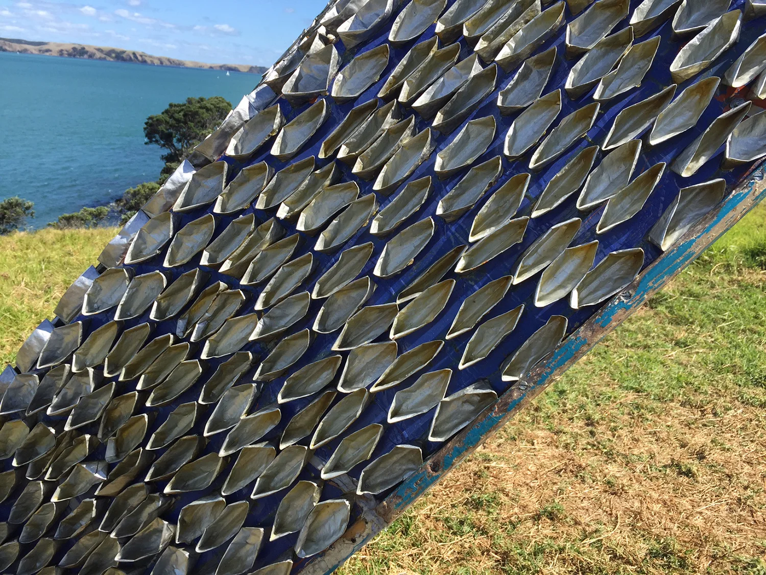 This very moving and powerful work is the culmination of a partnership between Tiffany Singh and the Auckland Resettled Community Coalition. She has used four abandoned boats from Waiheke Island and repurposed them as sound shells for refugee stories. Materials include emergency blankets, saris, clay and wood. The sound composition is by Steven Hue.